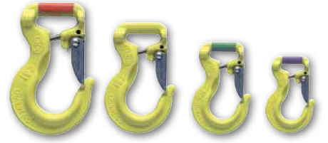 Os ganchos para laço redondo são codificados por cor para coincidir com o tamanho/capacidade correspondente do laço redondo: Vermelho=5T/Amarelo=3T/Verde=2T/Violeta=1T