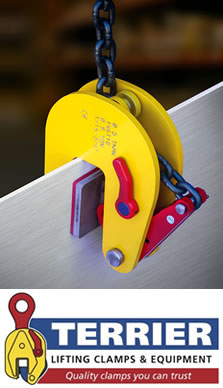 Dispomos de grampos pega chapas TERRIER CLAMPS – HOLANDA para movimentação, elevação, tombamento e transporte de chapas de aço.